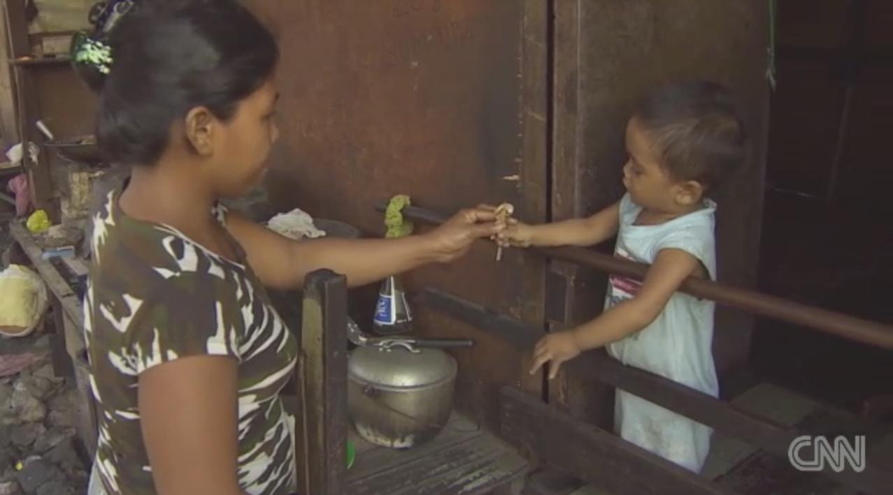 Morena Sumanda, bà mẹ 27 tuổi là khách hàng đầu tiên. Cô không có 20 peso để trả cho Felipa Fabon luôn, phải chờ tới khi chồng cô về cơ. Với chồng cô, 20 peso là bằng cả ngày lương rồi. Đứa con của Sumanda ngồi nhìn trong khi bà mẹ đang rửa thịt gà, bắc bếp và thêm một chút gia vị vào để nấu ăn.