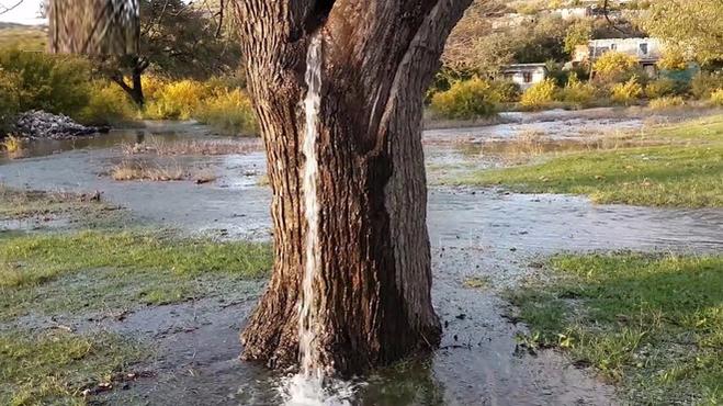 Điều này khiến nước trào ra và mạnh như vòi phun. Mạch nước ngầm bên dưới đồng cỏ có thể chứa rất nhiều nước sau mỗi trận mưa lớn. Chính vì vậy, sau khi trời mưa lớn, cây cổ thụ trên đồng cỏ này lại bỗng nhiên trở thành một vòi phun nước "bất đắc dĩ".