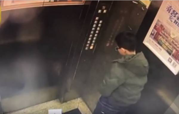Cậu bé Trung Quốc tiểu tiện làm chập bảng điều khiển thang máy. (Ảnh: Pear Video)