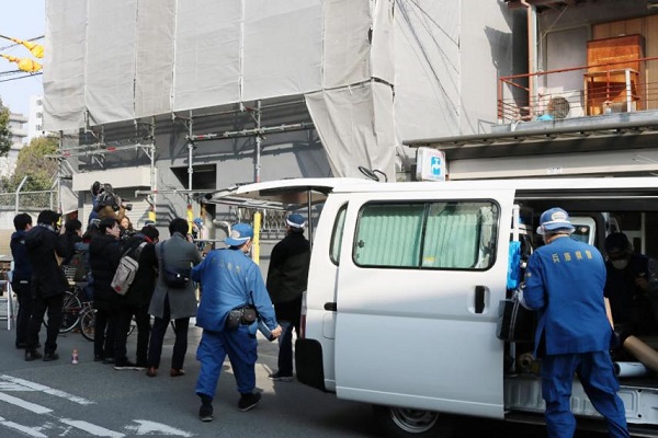 Cảnh sát và truyền thống đứng bên ngoài căn hộ ở Osaka, Nhật Bản