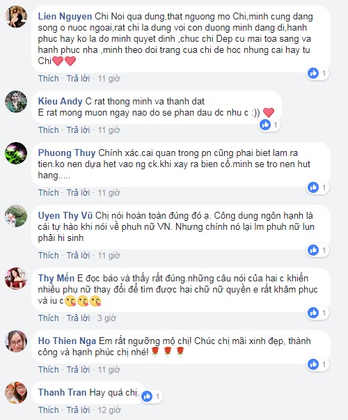 "Bởi khi chính bản thân mình là phụ nữ, mình nhận ra mình có một cái quyền như thế nào. Quyền được tôn trọng, quyền được yêu thương, quyền được bình đẳng, quyền được làm bất cứ những gì mình muốn, tự động các bạn sẽ điều chỉnh lại được đời mình. Và khi đã có chữ nữ quyền đó, các bạn sẽ độc lập hơn rất nhiều và có thể hoàn toàn quyết định được cuộc sống của mình. Cuộc sống của mình là do mình quyết định, không do bất cứ ai hết" - bà xã Bình Minh chia sẻ.