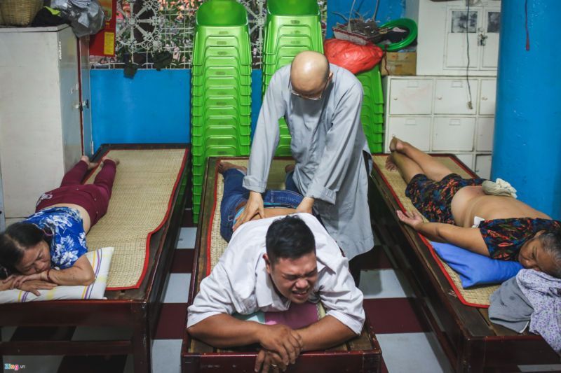Một bệnh nhân đang được sư thầy chữa chấn thương lưng do lao động nặng. (Hình: Báo Khám Phá)