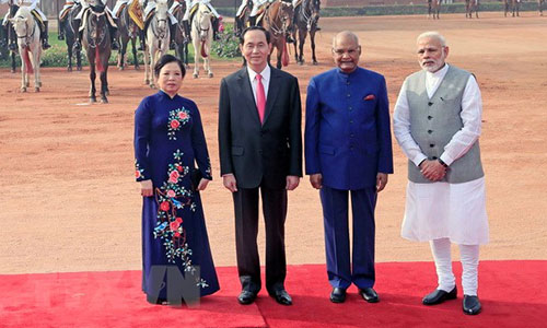 Tổng thống Ấn Độ Ram Nath Kovind hôm nay tổ chức lễ đón Chủ tịch nước Trần Đại Quang và phu nhân đến thăm với 21 loạt đại bác chào mừng, thông cáo của Bộ Ngoại giao Việt Nam cho biết. Đây là nghi thức đón cao nhất của Ấn Độ dành cho người đứng đầu một nhà nước.
