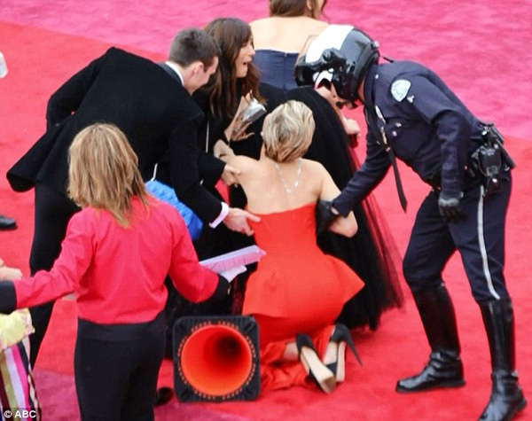 Trước đó hồi Oscar 2013, Jennifer Lawrence cũng "đi vào lịch sử" khi diện một chiếc váy dài chấm đất và "vồ ếch" ngay khi vừa bước lên bậc cầu thang.