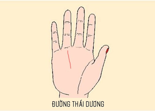 Đường thái dương nằm trên đường sinh mệnh hoặc trong gò Thái Âm chạy thẳng lên ngón đeo nhẫn. Nó chỉ sự thành công của đời người trên tất cả mọi mặt. Người sở hữu đường thái dương thẳng, nét đậm và sâu là những người rất giỏi kiếm tiền. Đường chỉ tay càng dài thì cho thấy bạn càng gặp được nhiều may mắn, lại hay có quý nhân giúp đỡ. Bên cạnh đó, đường chỉ tay này cũng thể hiện rằng mọi nỗ lực của bạn về sau sẽ được đền đáp.