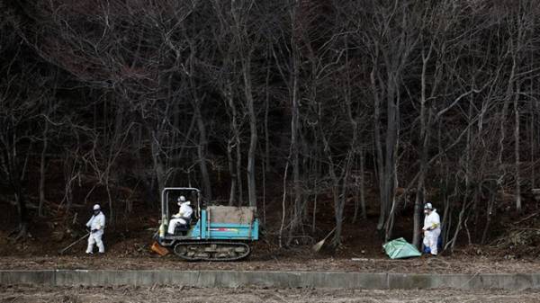 Các công nhân dọn dẹp chất thải ô nhiễm phóng xạ ở thị trấn Tomioka thuộc tỉnh Fukushima phải được trang bị đồ phòng hộ và mặt nạ chống ô nhiễm