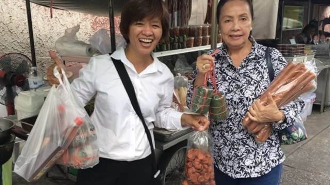 Chị bán đồ ăn Việt Nam như lạp xường, đậu phụ, dưa món. Ngày Tết chị bán thêm bánh chưng và giò.