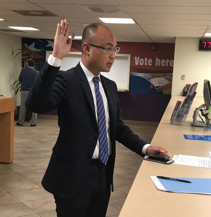Ứng cử viên Phạm Kim Long tuyên thệ khi nộp đơn ứng cử. (Hình: Phạm Kim Long cung cấp)