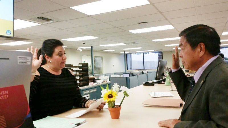 Ứng cử viên Tyler Diệp tuyên thệ khi nộp đơn ứng cử tại Sở Ghi Danh Bầu Cử Orange County.