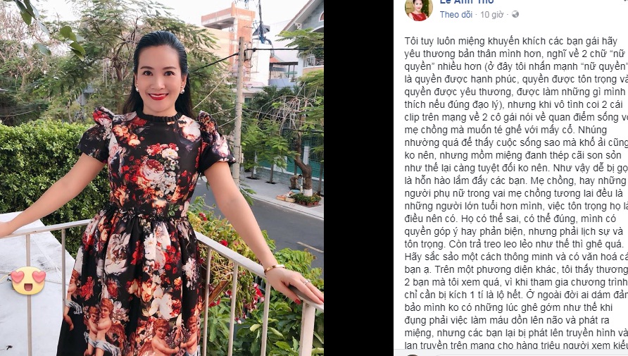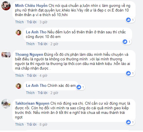 "Nhúng nhường quá để thấy cuộc sống sao mà khổ ải cũng không nên, nhưng mồm miệng đanh thép cãi son sỏn như thế lại càng tuyệt đối không nên. Như vậy dễ bị gọi là hỗn hào lắm đấy các bạn. Mẹ chồng, hay những người phụ nữ trong vai mẹ chồng tương lai đều là những người lớn tuổi hơn mình, việc tôn trọng họ là điều nên có. Họ có thể sai, có thể đúng, mình có quyền góp ý hay phản biện, nhưng phải lịch sự và tôn trọng. Còn trả treo leo lẻo như thế thì ghê quá" - chị Anh Thơ chia sẻ.