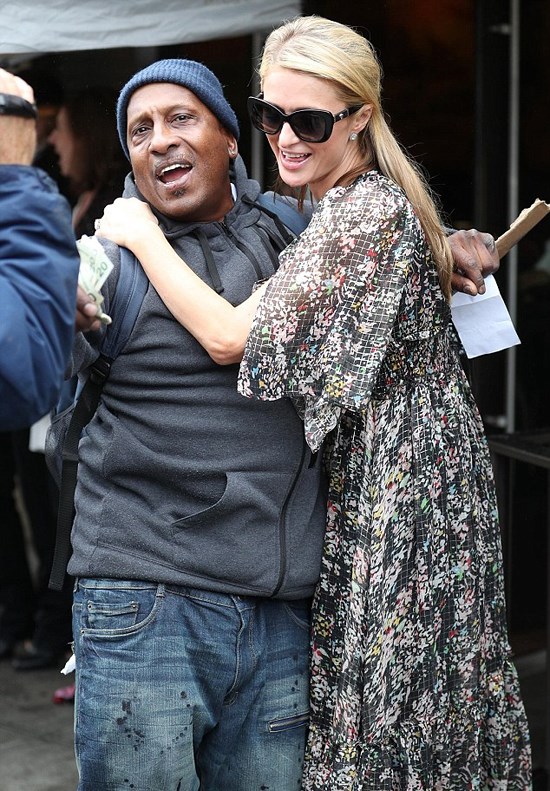 Người đàn ông có dáng vẻ lam lũ không giấu nổi niềm vui mừng và xúc động. Anh không chỉ được trò chuyện và ôm ngôi sao nổi tiếng mà còn được cô tặng khoản tiền lớn. Em gái (bên trái) cùng mẹ Paris mỉm cười khi chứng kiến sự hào phóng của cô.