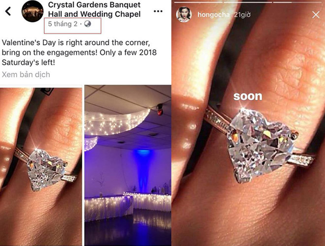 Cách đây không lâu, Hồ Ngọc Hà đã khiến giới truyền thông và dư luận "dậy sóng" khi đăng ảnh đeo nhẫn kim cương có hình trái tim "khủng". Bên cạnh đó, cô còn lấp lửng với dòng chia sẻ: “Soon” (Tạm dịch: Sớm thôi). Về phía Kim Lý, anh cũng nhanh chóng đáp trả người yêu với dòng trạng thái “I will” (Tạm dịch: Anh sẽ) khiến nhiều người tin rằng, nữ ca sĩ sẽ sớm theo chàng về dinh.