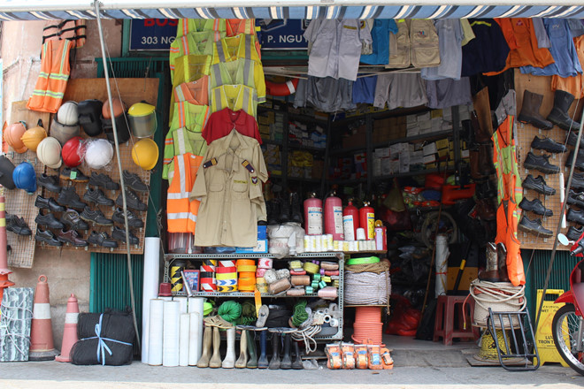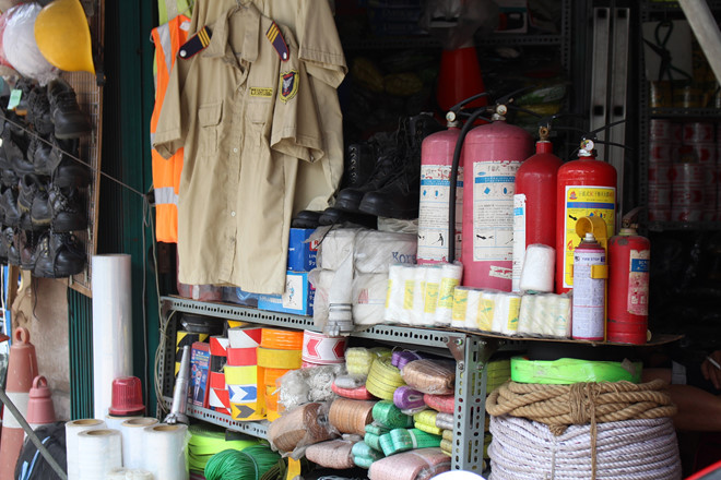 Các cửa hàng bán thiết bị PCCC, dụng cụ bảo hộ lao động ở chợ Dân Sinh thường chỉ bán cho khách mua là doanh nghiệp, công ty. Ảnh: Phúc Minh.