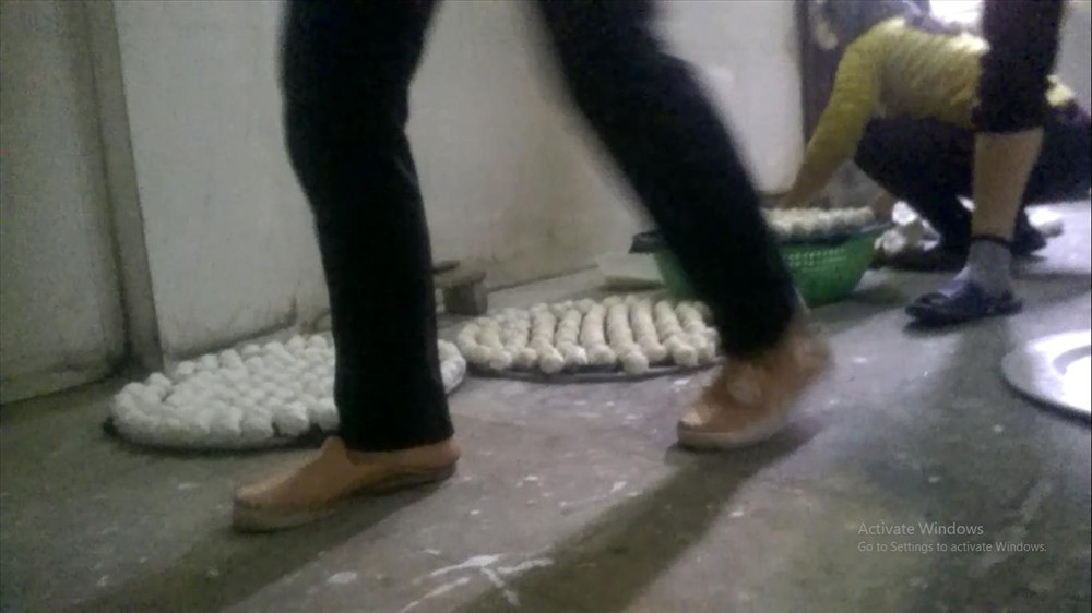 Nền nhà bẩn thỉu, nhớp nhúa. Nước bẩn và đất tràn lan, công nhân đi dép ra phố ngõ bẩn thỉu lại lội vào khu chế biến. Vậy mà bánh rán được bày hết ra mẹt, ra lớp bạt trải dưới sàn, rồi nặn, rồi lăn, rồi rán, bánh rơi ra đất lại “lăn” nó vào như thường. Bánh làm xong để ở cửa toa lét chờ nguội. Cửa toa lét bập bành toang hoang, bẩn thỉu. Nhân công làm việc không găng tay, không có bất cứ dụng cụ gì bảo hộ hay vệ sinh gì. Họ đi ủng cho đỡ bẩn chân. Sân ướt sũng nhớp nháp, bánh rán khô ròn lám nhàm đường rơi ra, họ lại nhặt vào rồi cõng đi bán rong luôn.