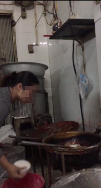 Cứ tay trần nặn, đổ nước, đổ phụ gia/ hóa chất màu mè vào rồi khuấy. Chỗ tay còn dính bột thì cọ rửa luôn bằng các gáo nước đang đổ vào chảo bột để khuấy. Các cái chảo làm ngày nọ qua ngày kia, nó không bao giờ được cọ. Bột, mật, bánh bị bê bết, cháy đen.