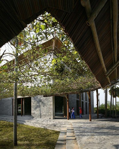 Hệ cấu trúc mái kết hợp với cây xanh hình thành lớp vỏ kép chống chọi lại với điều kiện khí hậu nắng nóng của vùng.