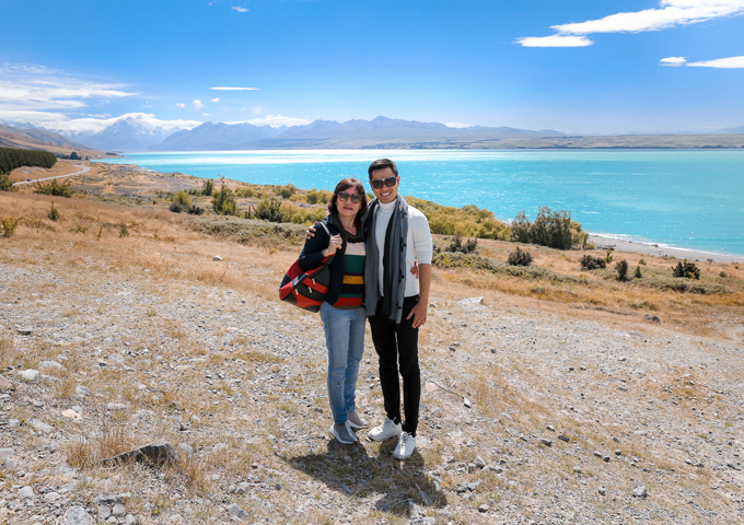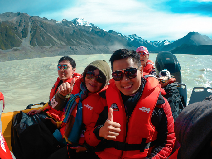 Sau đó, anh tham quan một hồ băng 500 năm khi đăng ký tour Tasman Glacier boat trip. Thời tiết ở đây thất thường, theo Khang, bạn chỉ có thể đi khi trời không mưa. Ngày đầu tiên trời mưa tầm tã, may là ngày hôm sau trời nắng, hai mẹ con có thể ra tận hồ băng, lấy một tảng băng và dùng lưỡi cảm nhận. Đây là một hồ rất đặc biệt, không có cá, rất lạnh nhưng cảnh xung quanh thì rất đẹp.