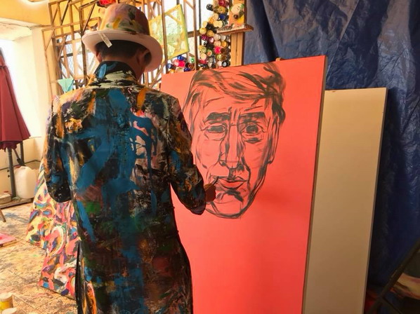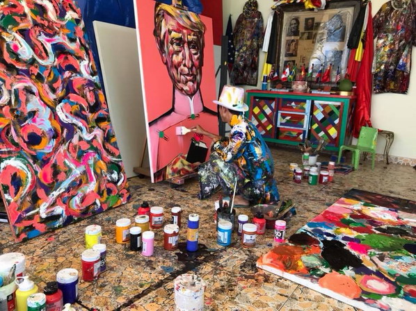 Vào ngày hôm nay, 6/4/2018, anh Hùng Cửu Long giới thiệu tranh vẽ về ông Trump. Đặc biệt ông Trump mặc áo dài, anh Hùng chia sẻ: