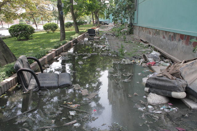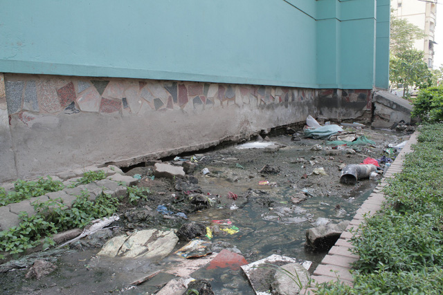 Nước thải và các loại rác sinh hoạt tràn ra quanh tòa nhà gây ô nhiêm trầm trọng