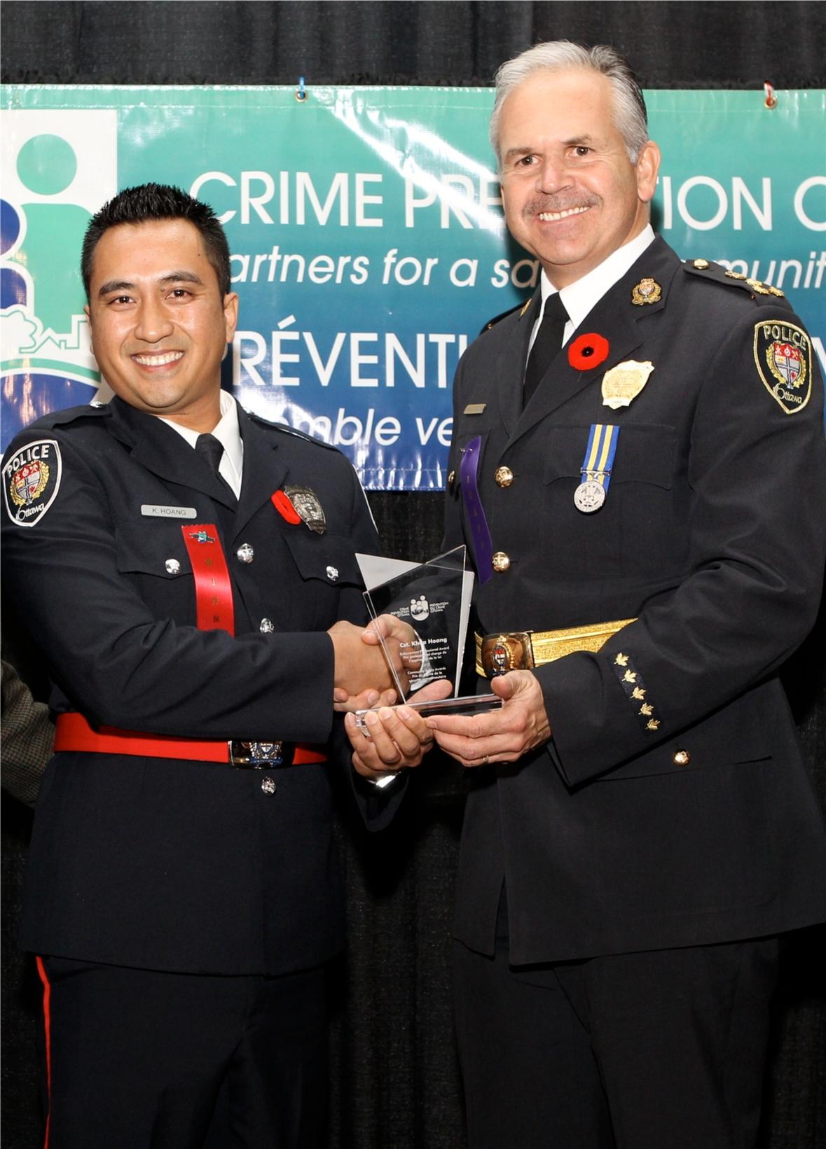 Hoàng Khoa được Cảnh Sát Trưởng Charles Bordeleau của Ottawa trao giải thưởng Cảnh Sát Ưu Tú (Top Law Enforcement Officer Award) năm 2012. (Hình: Ottawa Police Service)