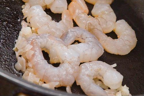 Bước 3: Trên chảo nóng, thêm ít dầu ăn, cho hành khô vào xào. Sau đó cho tôm vào xào gần chín.