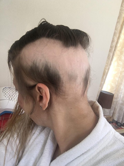 Gần 3 năm sau khi kết hôn lần hai, bà mẹ ba con vẫn không biết đến bao giờ tóc mới mọc trở lại.
