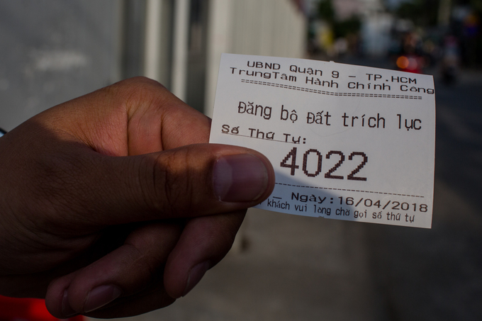 Có mặt trước UBND quận 9 từ 6h30, anh Duy khoe đã bốc được số thứ tự 22 (tính hai số cuối). "Tôi mong chính quyền cải cách mạnh mẽ hành chính để giải quyết thủ tục nhanh gọn cho người dân. Mỗi lần chờ đợi như này rất mệt mỏi. Bản thân tôi đã đi ba lần rồi nhưng vẫn chưa làm xong thủ tục", anh nói.