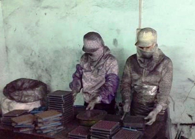 Nhóm công nhân sản xuất thuốc từ bột than tre tán mịn.