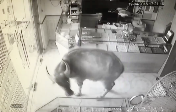 Chủ tiệm đã quan sát thấy chạy vội ra hòng đóng cửa chặn lại nhưng bất thành đành nhanh tay bế con chui vào phòng lánh nạn. Chú trâu chui hẳn vào tiệm nằm điều hoà một chút cho hạ hoả, sau đó đứng dậy ngắm nghía khắp nơi như đang chọn cho mình bộ trang sức lung linh nhất.