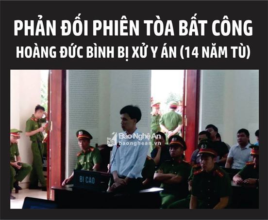 "Phiên toà anh Hoàng Đức Bình mở lúc 8:00 kết thúc lúc 11:15. Kết quả y án sơ thẩm 14 năm."