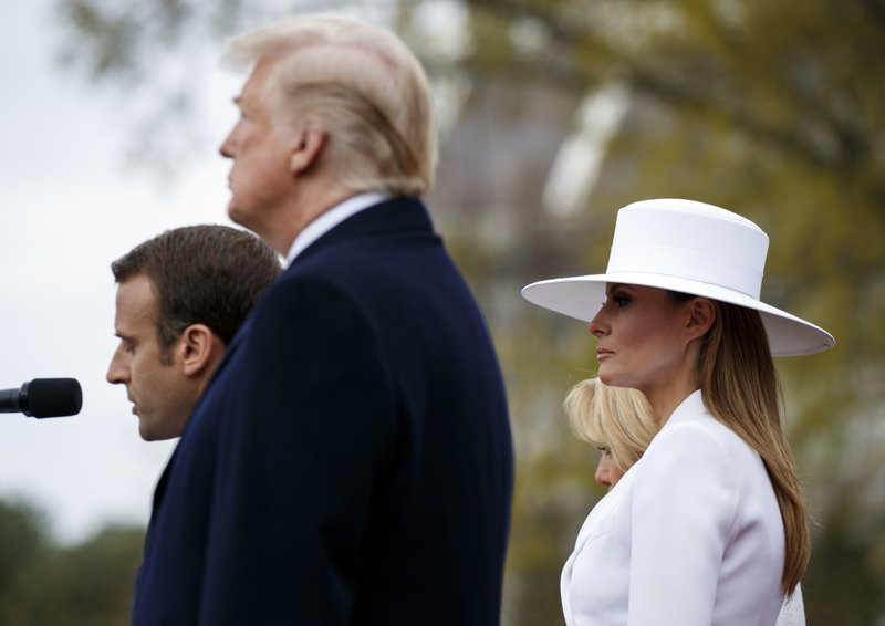 Bà mặc nguyên trang phục khi trở lại Nhà Trắng để tham dự buổi họp báo chung của chồng và ông Macron. Chiếc mũ là thiết kế của Herve Pierre, stylist người Pháp của đệ nhất phu nhân Mỹ. Theo AP, bộ trang phục đã trở thành đề tài "chế" ảnh của cư dân mạng sau sự kiện. Ảnh: AP.