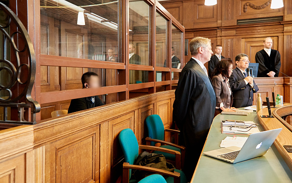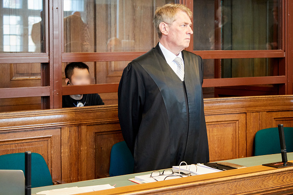 Nguyễn Hải Long ngồi ở phía sau được che mặt trên tấm ảnh. Đứng phía trước ông là luật sư Stephan Bonell tại tòa Kammergericht Moabit ở thủ đô Berling ngày thứ Ba, 24 tháng 4, 2018. (Pool/ Getty Images)