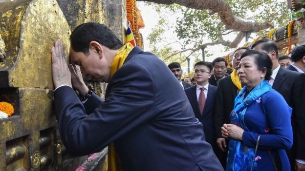 Chủ tịch Trần Đại Quang và phu nhân Nguyễn Thị Hiền thăm chùa Mahabodhi ở Bodhgaya, bang Bihar, Ấn Độ hôm 2/3/2018