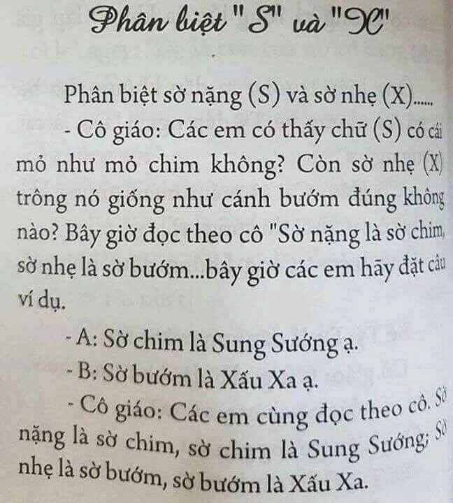 Phân biệt S và X, sờ chim sung sướng, còn sờ bướm xấu xa. Không hiểu nổi sách giáo khoa VC lại lấy cái ví dụ này để dạy học sinh, bó cu teo.
