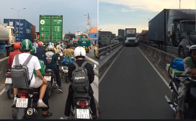 Mới đây, một video được đăng tải lên mạng xã hội cho thấy nhiều người đi xe máy phải 'chôn chân tại chỗ' trên cầu Phú Mỹ (quận 7, TP.HCM) vì bị kẹp giữa hai xe tải container.