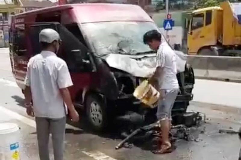 Chiếc xe máy bị kẹt trước đầu xe Limousine rồi cả xe máy và đầu xe Limousine bốc cháy. Hành khách khiếp hoảng, khẩn trương xuống khỏi xe Limousine.