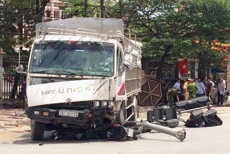Một chiếc xe tải đã gây tai nạn liên hoàn khi đâm bay bốt CSGT, cột đèn tín hiệu rồi tông trúng xe máy. Vụ tai nạn này đã khiến một người chết tại chỗ và một người bị thương nặng.