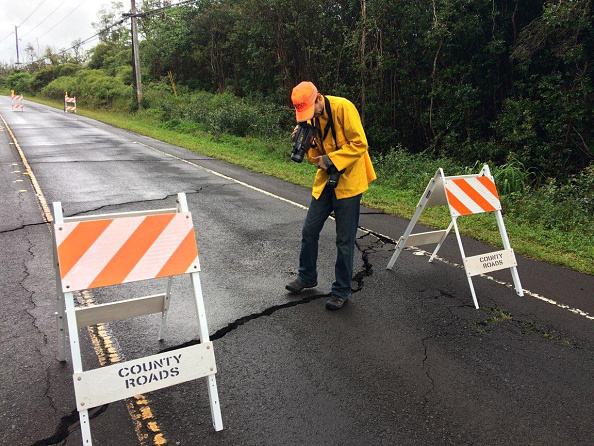 Động đất tại California có liên quan gì đến núi lửa Hawaii không? Trong hình do cơ quan Khảo Sát Địa Chất Hoa Kỳ cung cấp ngày thứ Hai, một chuyên viên đang thu thập chi tiết về một đường nứt trên bang lộ 130 do sự rung chuyển của núi lửa gây ra tại Puna, Hawaii. (Getty Images)