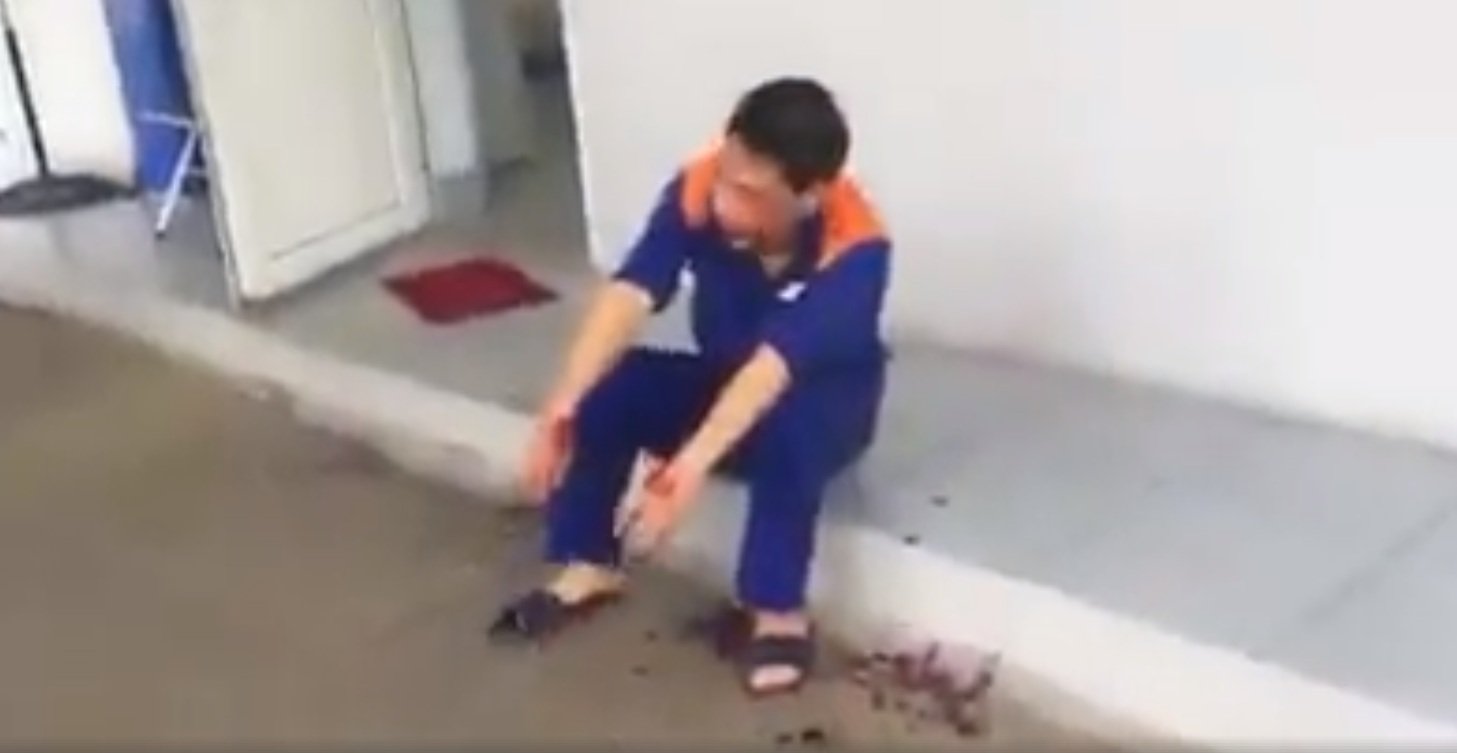 Nam nhân viên cây xăng ngồi khóc sau khi bị đánh chảy máu mồm (ảnh cắt từ clip)