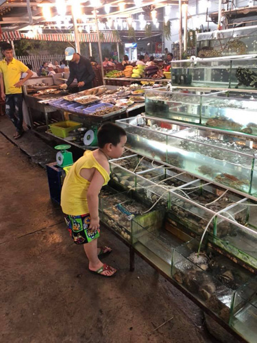 Tại chợ đêm, Gấu cũng rất thích đứng nhìn các bể cá lớn nhỏ xếp san sát nhau ở các cửa hàng ăn. Ảnh: NVCC.