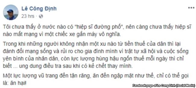 Cựu tù nhân lương tâm Lê Công Định qua trang Facebook cá nhân gọi các hiệp sĩ là những người không nhận một xu nào từ tiền thuế của dân lại “đánh đổi mạng sống và rủi ro cho gia đình mình” vì trật tự xã hội và cuộc sống yên bình của nhân dân. Ông nêu lên hình ảnh tương phản là lực lượng mà ông gọi là “hùng hậu ngốn thuế mỗi ngày” lại chỉ biết “ung dung điều tra sau khi có kẻ chết thay mình”.