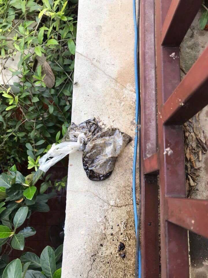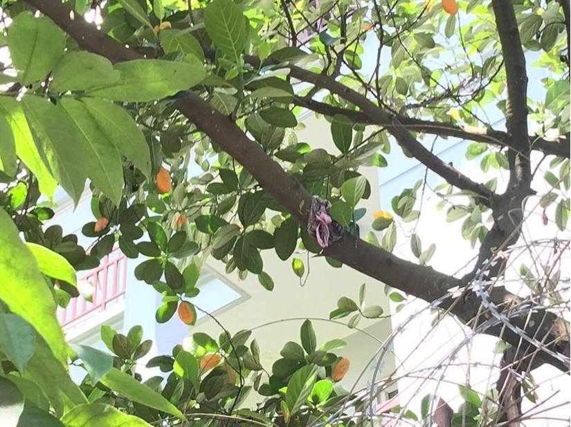 Túi chất bẩn ném vào nhà bị mắc vào cành cây