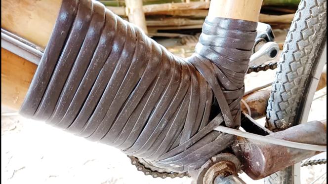 Điều đặc biệt là thứ dùng để kết nối những bộ phận trên khung sườn lại với nhau không phải là ốc vít, hay các mối hàn mà bằng dây mây và chốt tre.
