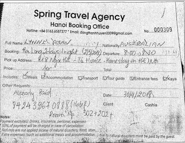 Sau khi nhận được thông tin, UBND tỉnh Quảng Ninh đã chỉ đạo các cơ quan liên quan kiểm tra, xác minh và được biết, du khách Lynne Ryan, quốc tịch Úc đã mua tour du lịch Hạ Long 2 ngày 1 đêm tại văn phòng du lịch Spring Traval Agency (số 21, ngõ Huyện, quận Hoàn Kiếm, Hà Nội).