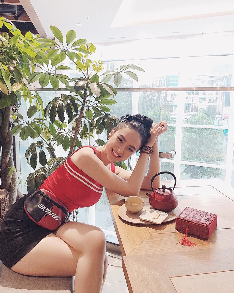 Hình ảnh Angela Phương Trinh mặc áo dây kết hợp với chân váy tạo dáng trong một quán trà đủ "gây thương nhớ" cho người đối diện.