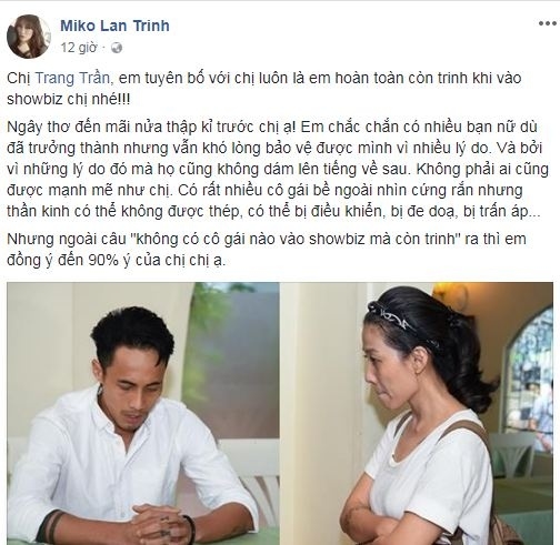 Mới đây, cựu người mẫu Trang Trần và nữ ca sĩ Miko Lan Trinh vừa có một cuộc tranh luận nảy lửa về chuyện trinh tiết. Cụ thể là cựu người mẫu Trang Trần gây sốc khi phát ngôn về các cô gái hoạt động showbiz: "Không ai vào showbiz mà còn trinh". Ngay lập tức, Miko Lan Trinh thẳng thắn phản bác: "Chị Trang Trần, em tuyên bố với chị luôn là em hoàn toàn còn trinh khi vào showbiz chị nhé! Ngây thơ đến mãi nửa thập kỉ trước chị ạ! Em chắc chắn có nhiều bạn nữ dù đã trưởng thành nhưng vẫn khó lòng bảo vệ được mình vì nhiều lý do. Và bởi vì những lý do đó mà họ cũng không dám lên tiếng về sau. Không phải ai cũng được mạnh mẽ như chị. Có rất nhiều cô gái bề ngoài nhìn cứng rắn nhưng thần kinh có thể không được thép, có thể bị điều khiển, bị đe dọa, bị trấn áp".