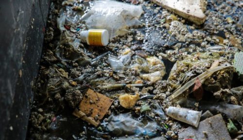 Kim tiêm lẫn rác thải và đồ nhựa khó phân hủy nổi lềnh bềnh trên mặt nước