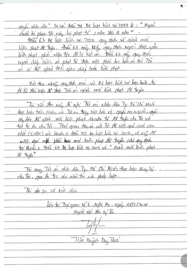 Đơn được anh Thức gửi đi từ trại giam vào ngày 28-1-2018 với các căn cứ: