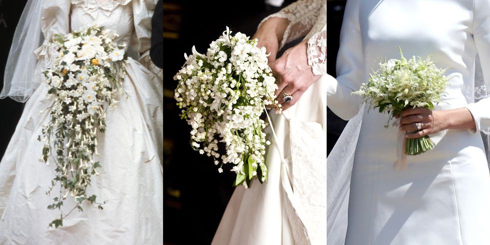 Cả ba cô dâu Hoàng gia đều sử dụng hoa cưới màu trắng cài thêm một nhánh sim, biểu trưng cho tình yêu và hy vọng. Bó hoa cưới của Meghan còn được cài thêm một nhành hoa "Xin đừng quên em" - Chi lưu ly - do chính tay Hoàng tử Harry chọn.