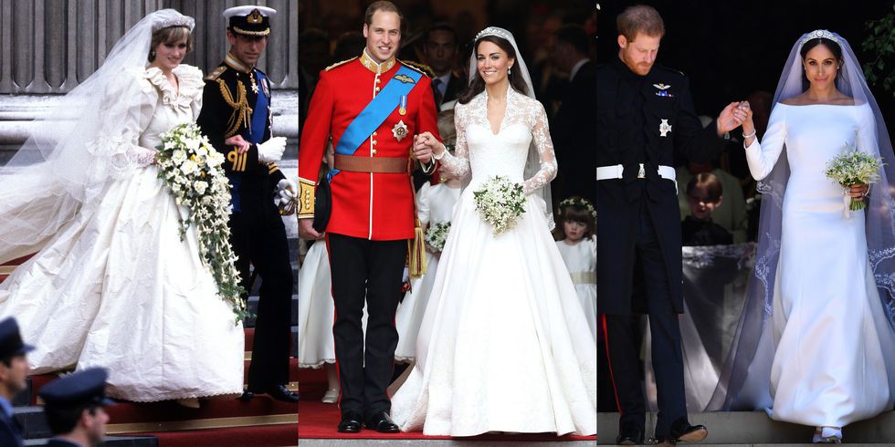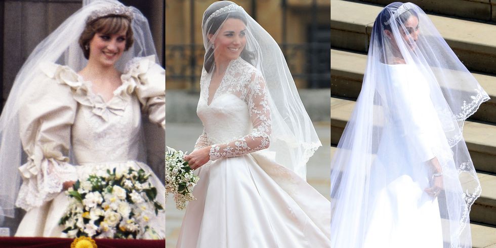 Trong lễ cưới năm 1981, Công nương Diana đã chọn một chiếc váy cưới tay phồng bằng vải bông thô của vợ chồng nhà thiết kế David và Elizabeth Emanuel ở London. Kate Middleton mặc một chiếc váy cưới dài tay mang tính biểu tượng của Alexander McQueen, trong khi Meghan chọn chiếc váy cưới tối giản cộp mác Audrey Hepburn-esque